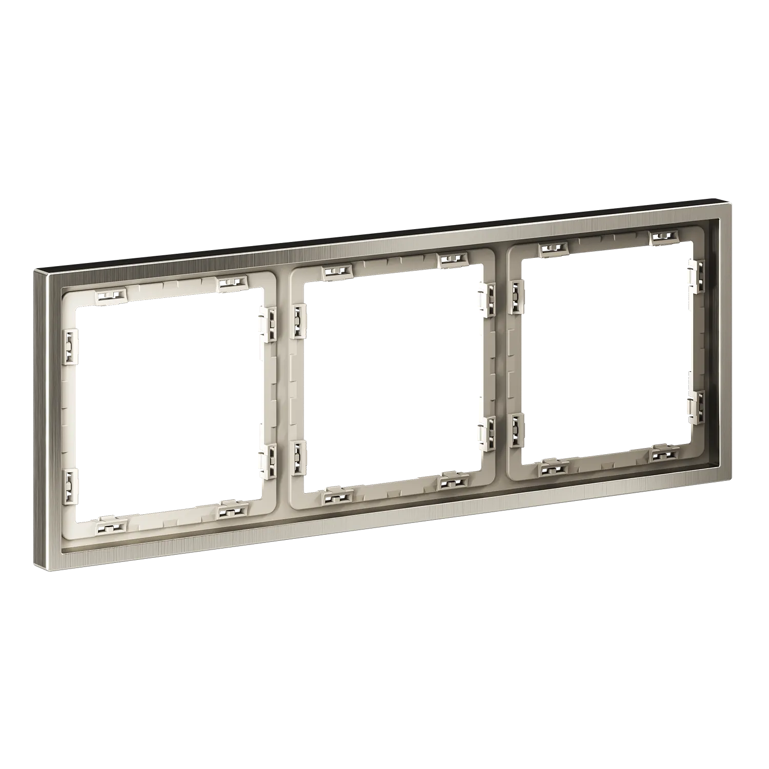 Все элементы в цвете «никель» формируют непрерывную линию без визуальных разрывов. Смотрите также рамки цвета «платина» для холодной элегантности или «латунь» для тёплых интерьеров с характером.