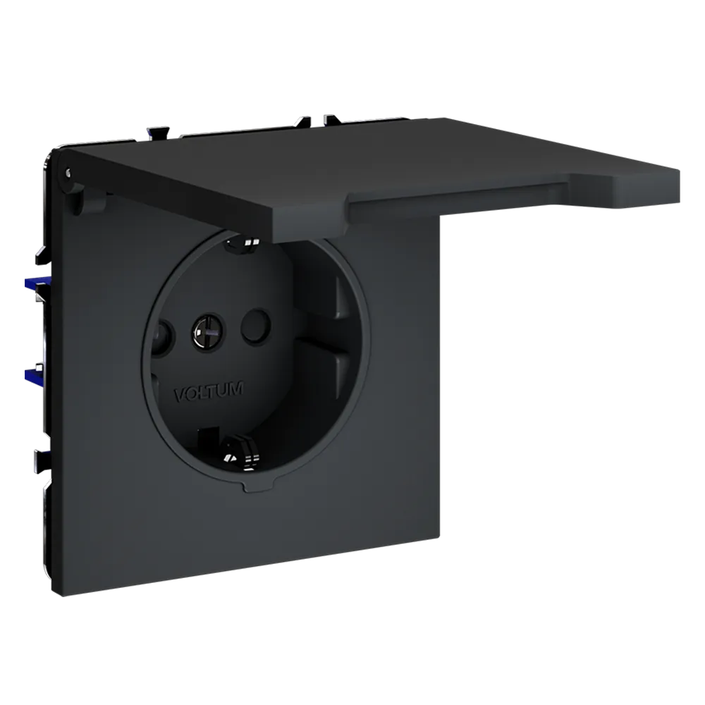 Благодаря степени защиты IP40 и наличию крышки, розетка надёжно защищена от проникновения твёрдых частиц и брызг воды, а встроенные шторки предотвращают доступ детей к контактам. Это делает изделие одним из самых безопасных в линейке Voltum.