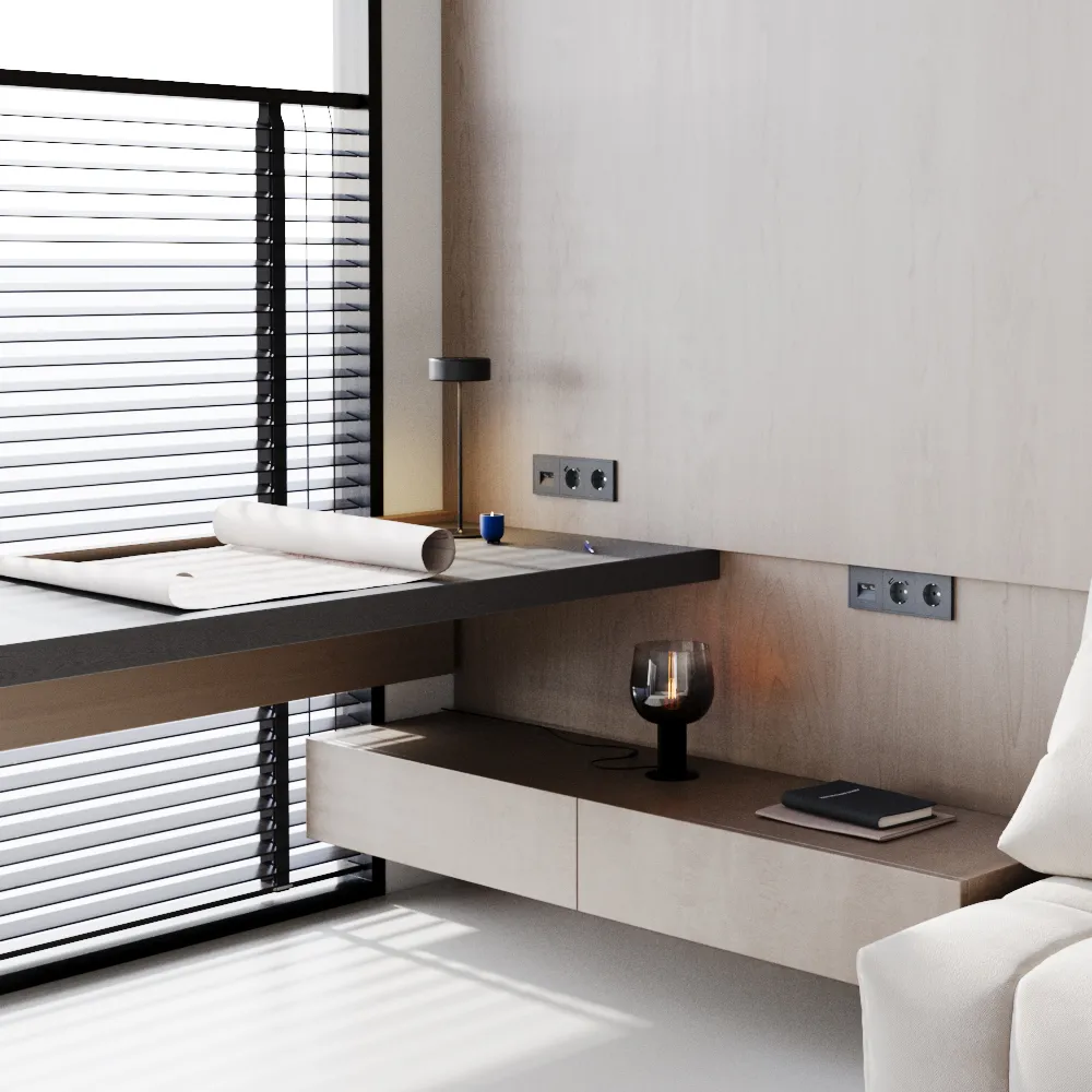 Розетка полностью совместима с пластиковыми и стеклянными рамками той же серии и гармонично вписывается в любые композиции из электрических розеток, выключателей и мультимедийных устройств VOLTUM S70.